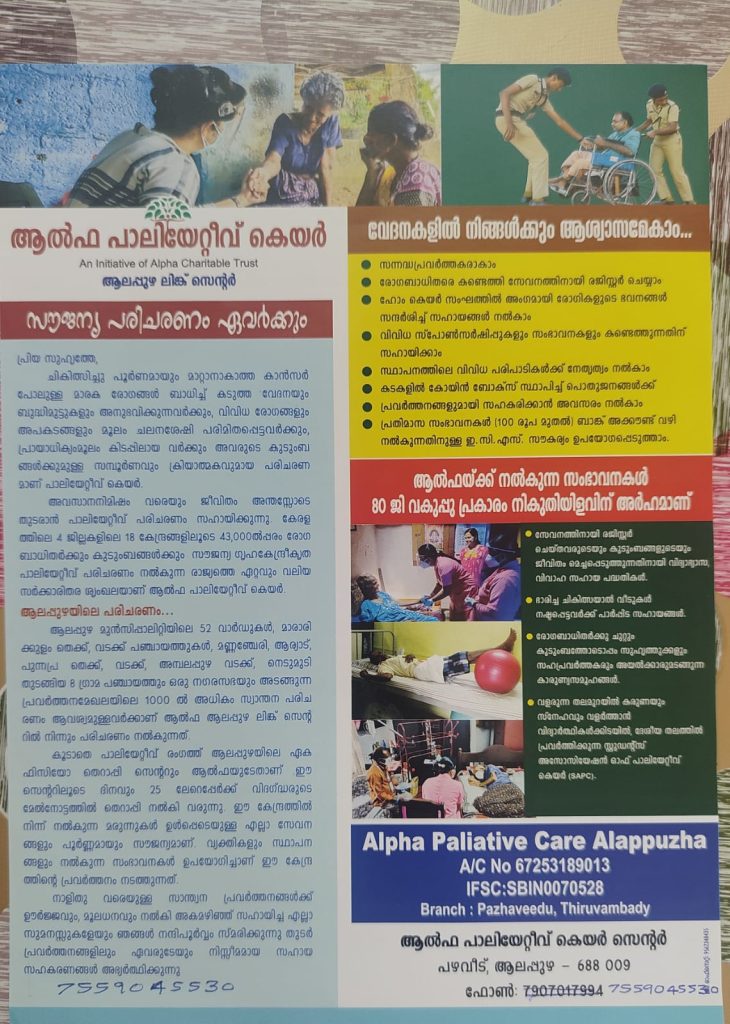 ആൽഫ പാലിയേറ്റിവ് കെയർ എന്നും ജനങ്ങളോടപ്പം ജിസിഡി യുടെ ആലപ്പുഴ ജില്ലാ ചെയർമാൻ സ്ഥാനം വഹിക്കുന്ന ശ്രീ രാമചന്ദ്രൻ ആൽഫ പാലിയേറ്റിവ് കെയറിന്റെ ആലപ്പുഴ ജില്ലാ ട്രഷറര് കൂടിയാണ് നിരാലംബരയാ ജനങ്ങൾക്കു എന്നും ഈ പ്രസ്ഥാനം ഒരു മുതൽക്കൂട്ടാണ് ജിസിഡി ന്യൂസ് പ്രത്യേകം അഭിനന്ദനങ്ങൾ അറിയിക്കുന്നു